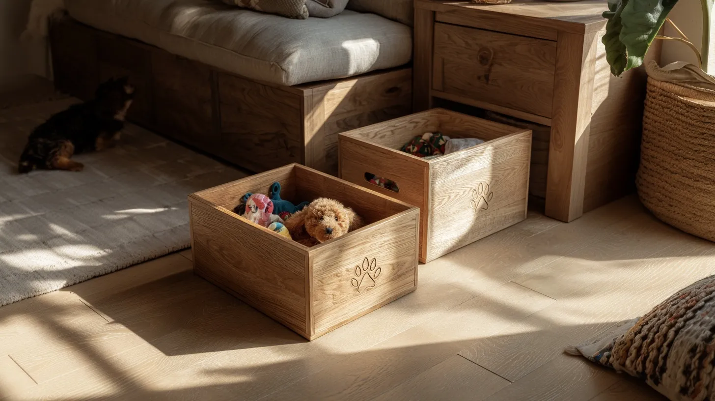 Minimal Wooden Pet Toy Storage Box With Paw Cutouts