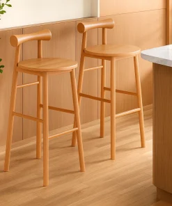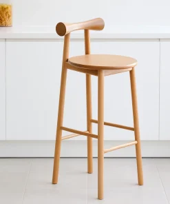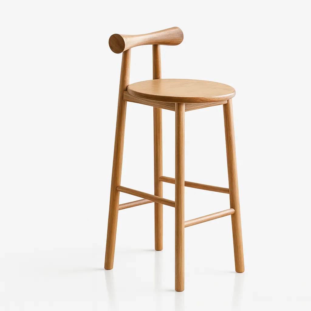 Crafted with a modern aesthetic, this wooden bar stool features a sleek round seat and a gently curved backrest for added comfort and style. Its simple form fits naturally into a variety of interior settings. The stool is supported by sturdy legs with integrated footrests, providing balance and ease while seated. Its wood tones bring warmth and character to the design, making it suitable for both casual and contemporary spaces.