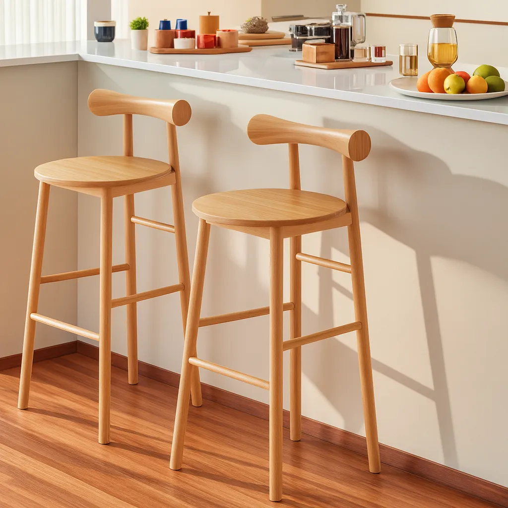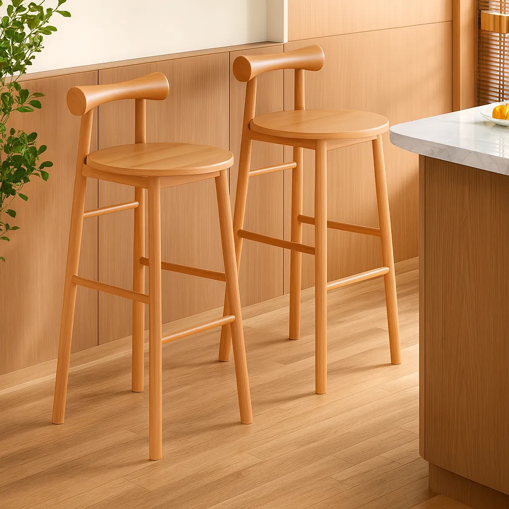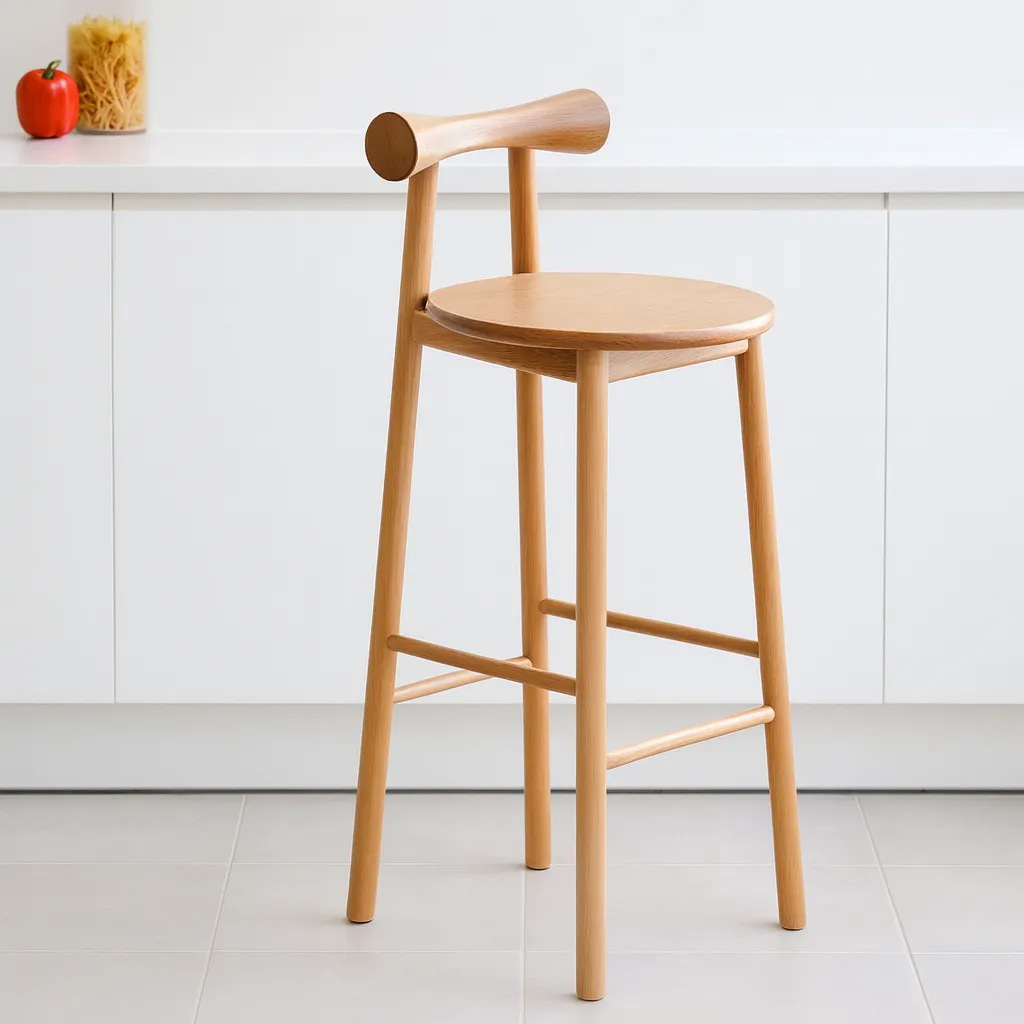 This modern wooden bar stool combines a rounded seat, supportive backrest, footrest, offering a clean and versatile seating option for kitchen counters or bars.
