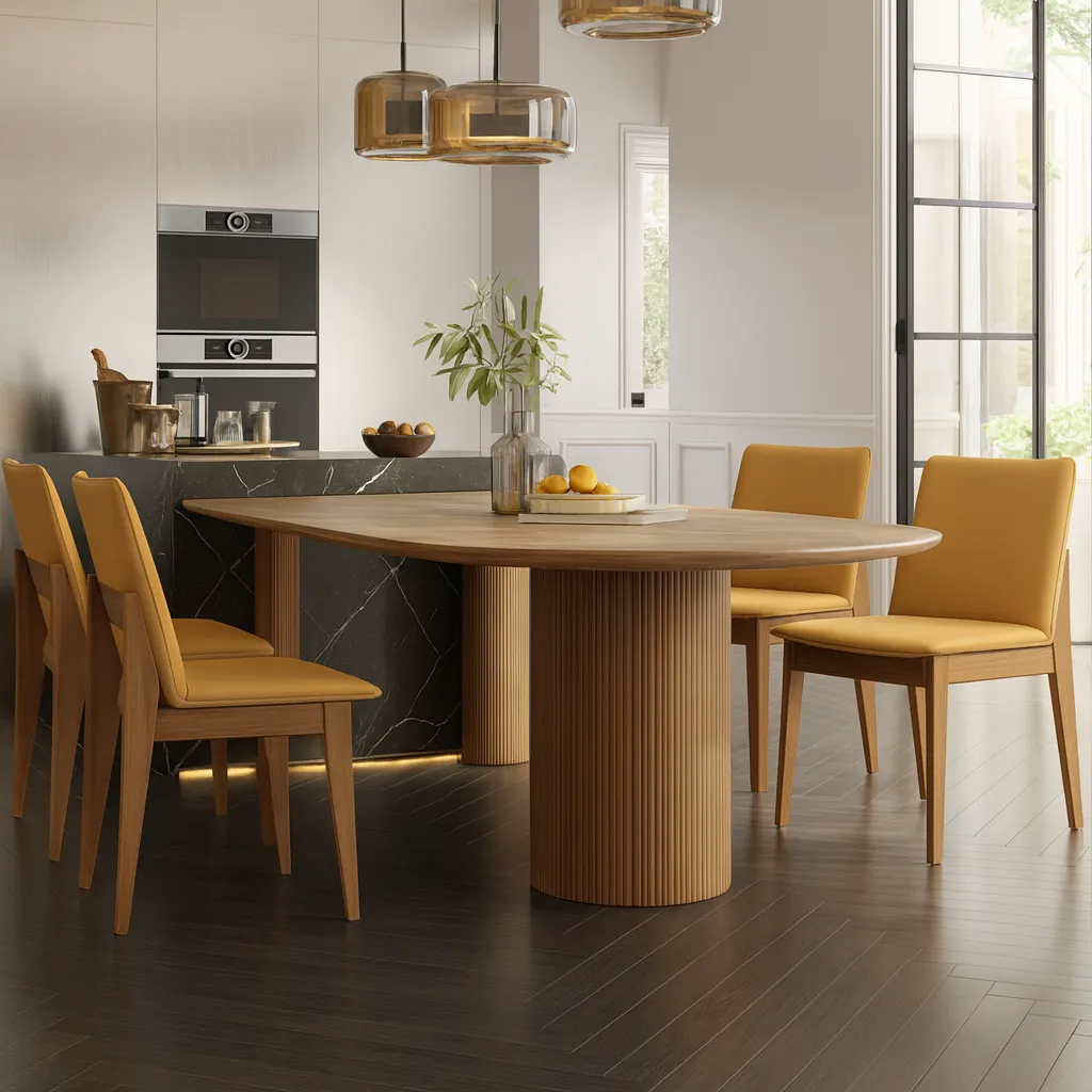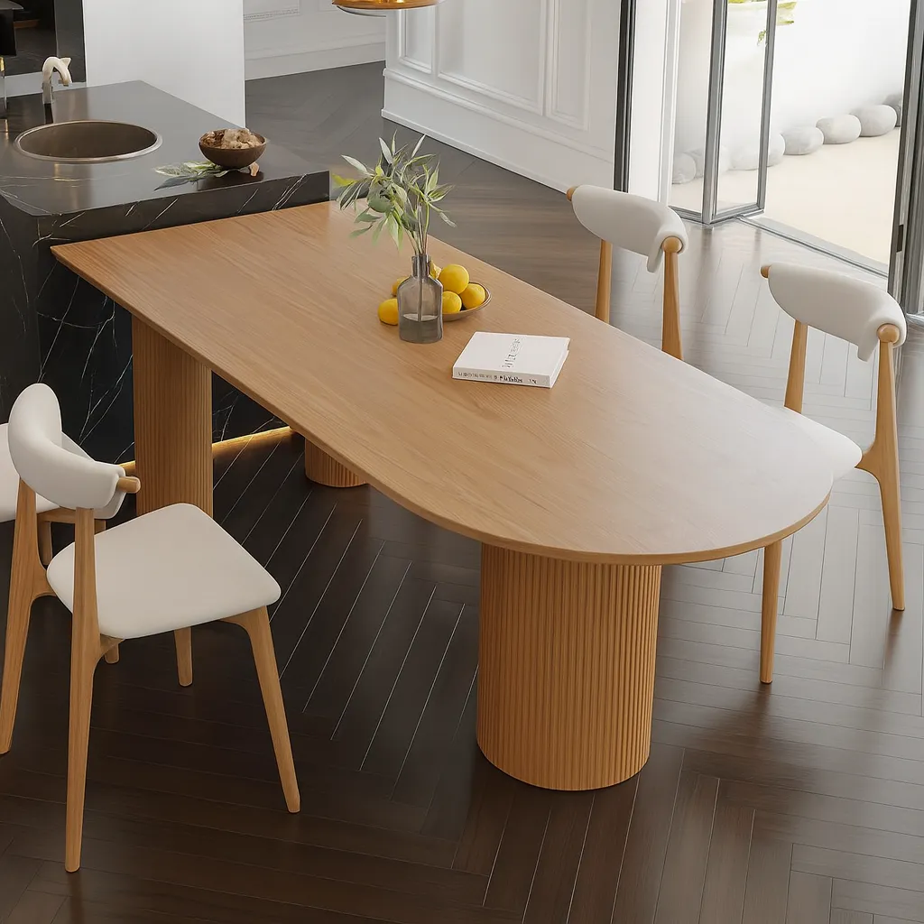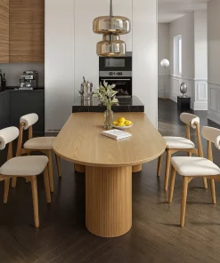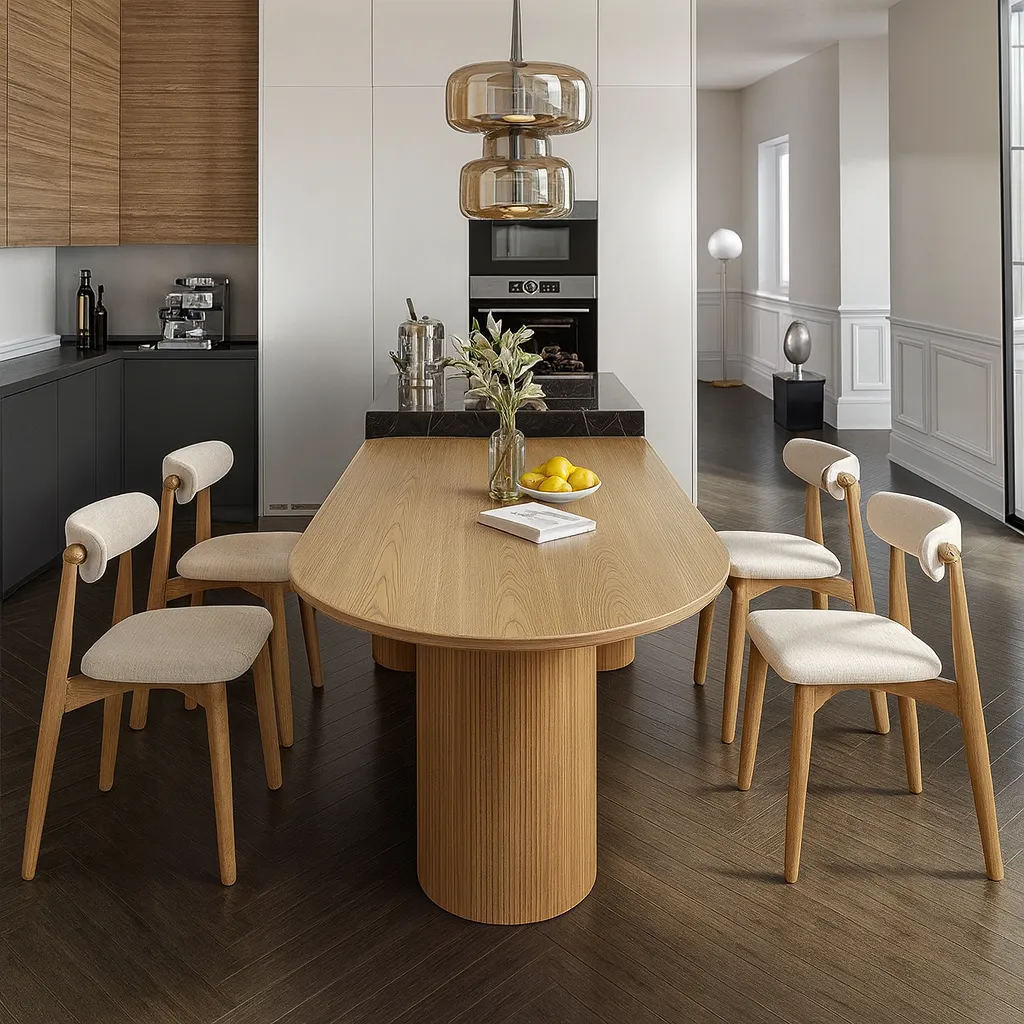 This modern oval dining table features a spacious top and cylindrical pedestal base, offering a sleek and functional choice for kitchen spaces.