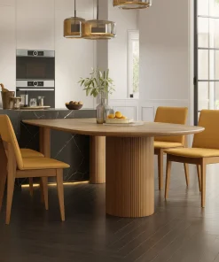 With its refined oval design, this dining table brings both style and practicality to everyday meals. The smooth surface provides ample space for family dining, while the rounded edges create a softer look that blends seamlessly with contemporary interiors. The table is supported by a cylindrical pedestal base, which ensures stability and adds a bold design element. Its well-balanced proportions make it suitable for both small and large kitchens, enhancing the overall dining experience.