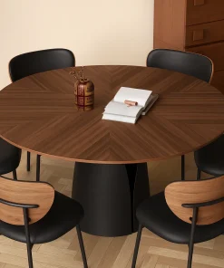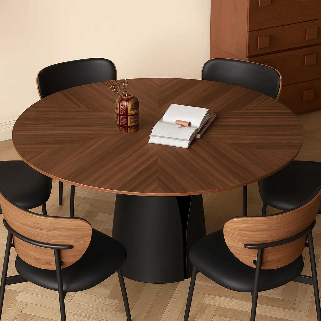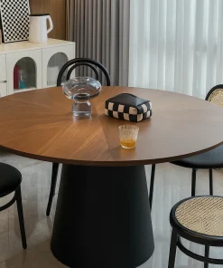 With its contemporary design, this round dining table brings elegance and function to any dining area. The circular top provides a welcoming space for meals and conversations, making it suitable for both everyday use and gatherings. The table stands on a base that enhances stability while adding an artistic touch. Its balanced proportions allow it to integrate seamlessly into different room layouts and interior styles.