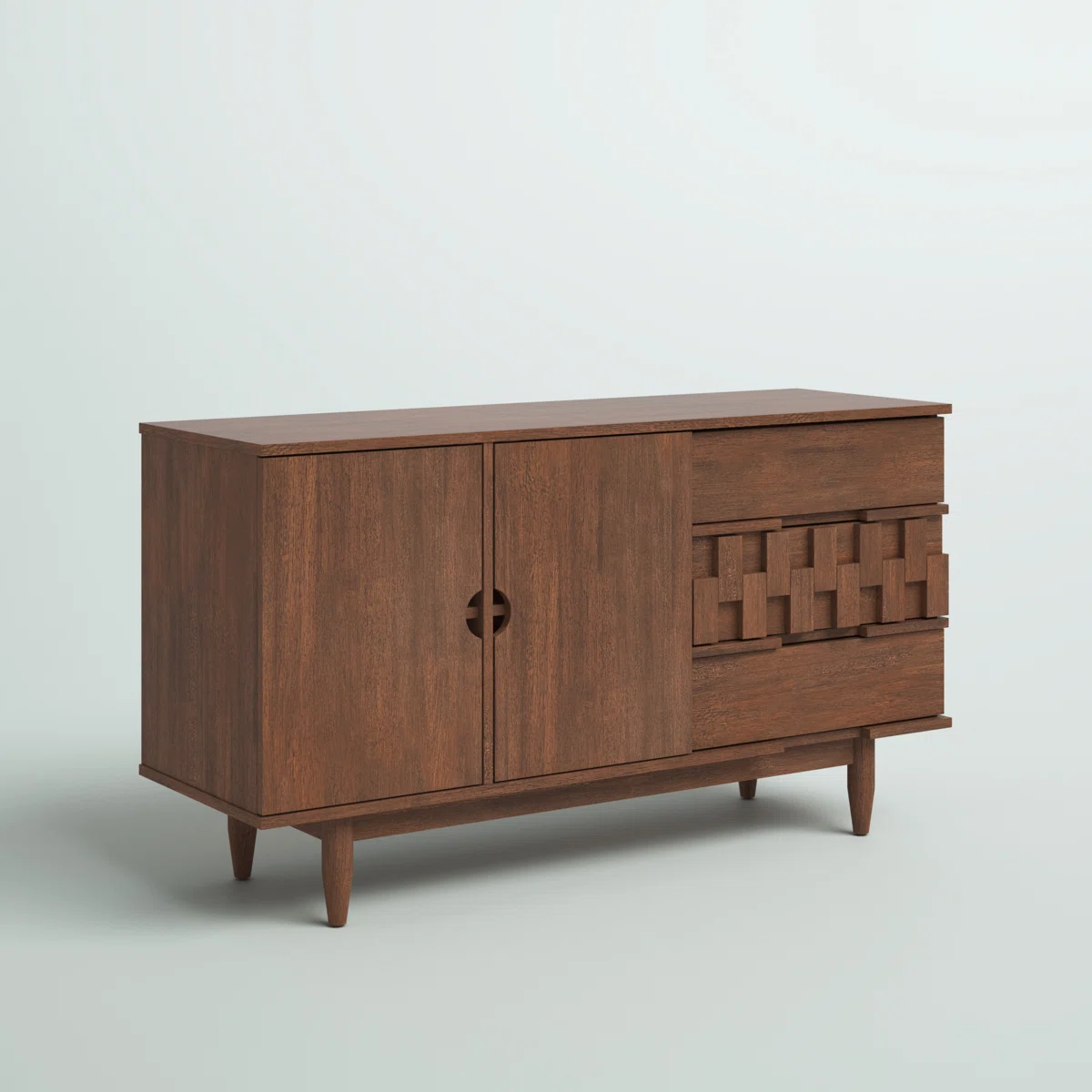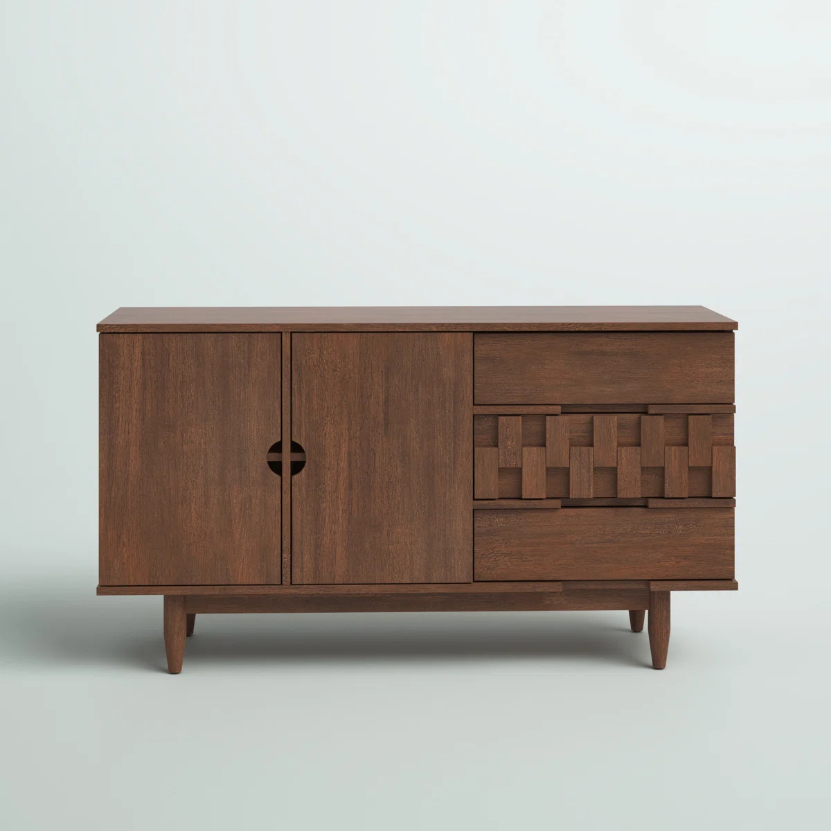 Designed with a modern aesthetic, this sideboard cabinet combines functionality with a distinctive look. The multiple drawers provide space for utensils, linens, or smaller essentials, while the double doors open to reveal a compartment suitable for larger items. The geometric detailing on the drawers adds visual interest, giving the piece a refined yet contemporary character. Its compact, elongated shape makes it ideal for dining rooms, living rooms, or hallways where extra storage is needed.