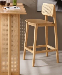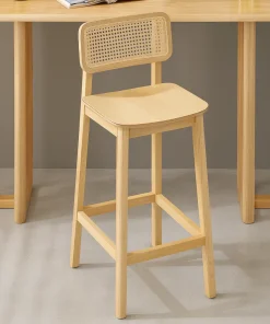 This modern wooden bar stool features a woven rattan backrest and foot support, offering comfort and style for kitchen or dining spaces.