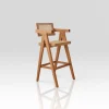 Crafted with a modern design, this wooden bar stool combines natural warmth with functional seating. The smooth wooden seat is complemented by a woven rattan backrest, adding texture and a touch of airy elegance. The stool includes a supportive footrest, ensuring comfort during extended use. Its sturdy wooden frame provides stability while maintaining a light and natural look that pairs well with a variety of interiors.