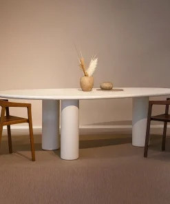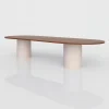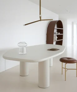 This modern wooden dining table features an irregular top with rounded edges and cylindrical legs, creating a bold and functional centerpiece for dining spaces.