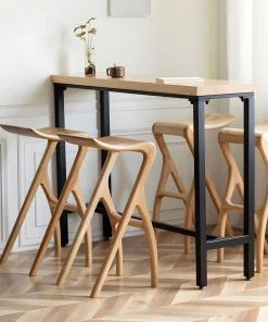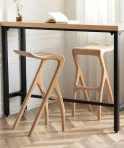 This modern wooden bar stool features a sculpted backless seat and artistic frame design, offering a stylish seating option for various spaces.