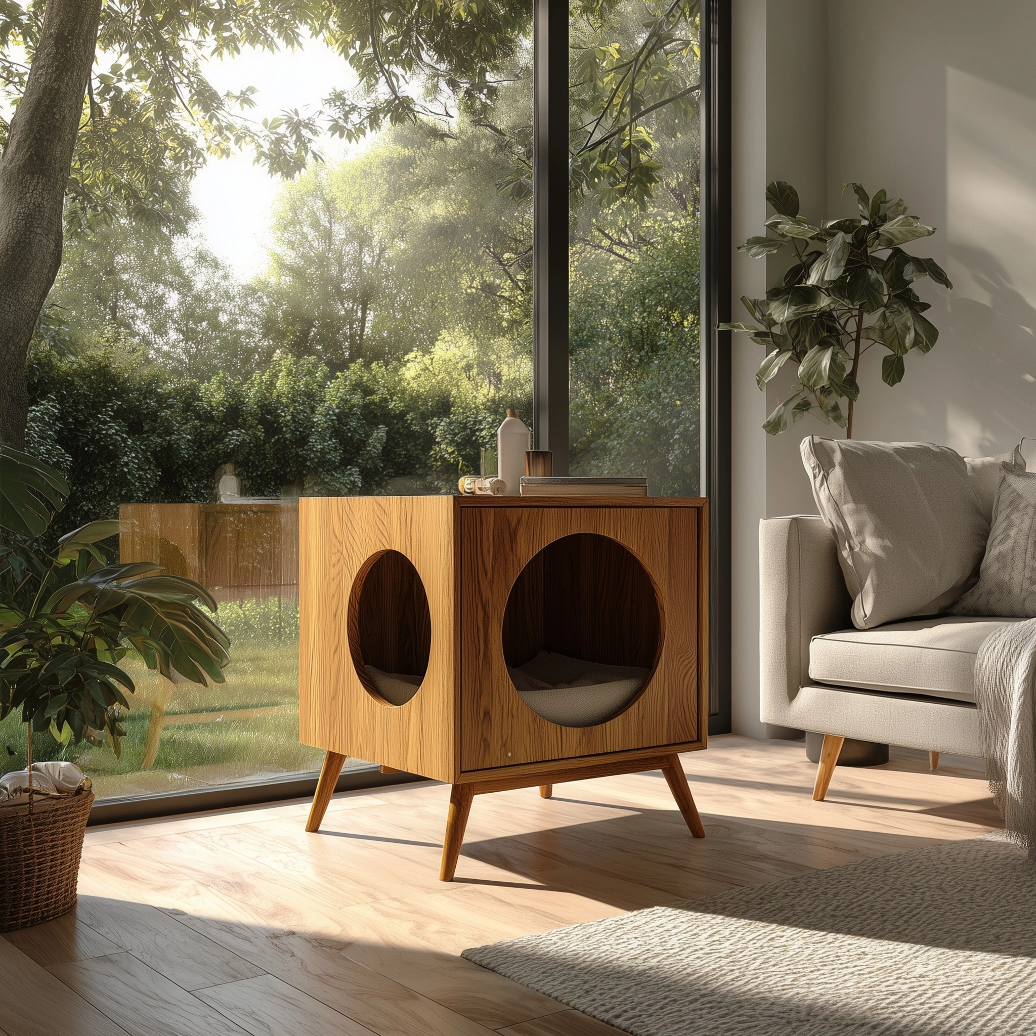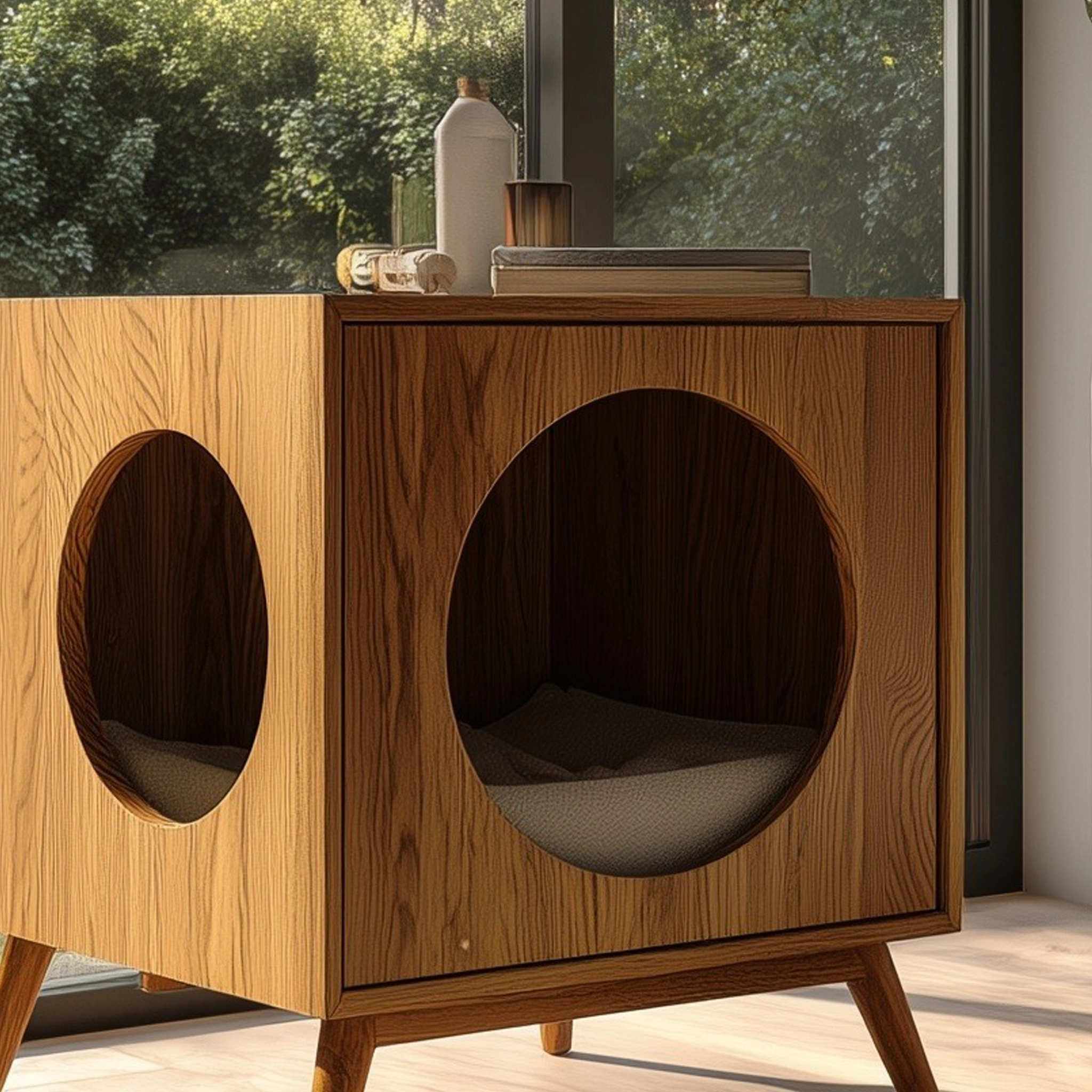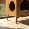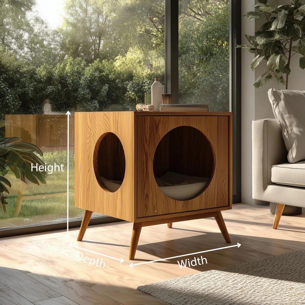 The Indoor Wooden Cat Hideaway Side Cabinet is designed to fit effortlessly into your home while providing a peaceful space for your cat to relax. With its sleek, minimalist design and two circular openings, your pet can easily access their hideaway, while the wooden structure complements your home’s decor. The cabinet features a spacious interior with soft bedding for comfort and is ideal for smaller spaces. Its clean lines and warm wood finish enhance any room, making it a perfect addition to your living area or bedroom.