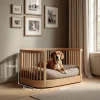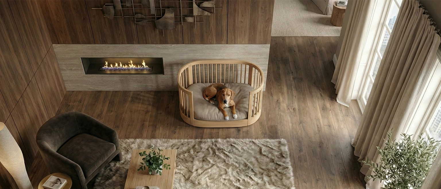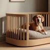 This minimalist dog bed is designed as an indoor resting surface for dogs, featuring a low-profile wooden base with an open rail structure around the sides. Its supplies-inspired form allows it to blend naturally into living spaces while offering a clearly defined area for pets to rest.