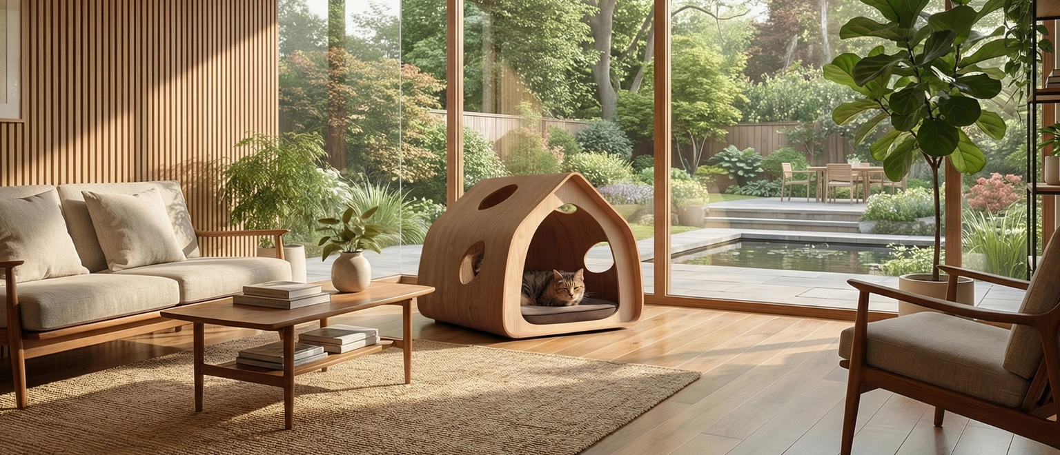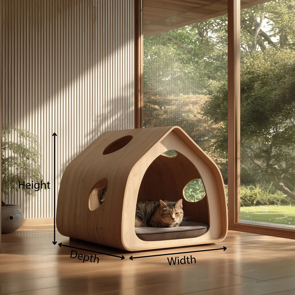 This minimalist pet shelter house is designed as an enclosed indoor resting space, featuring a house-shaped wooden form with a front entrance and additional side openings. Its structured yet gentle silhouette allows it to function as pet supplies that fits naturally into everyday living spaces.