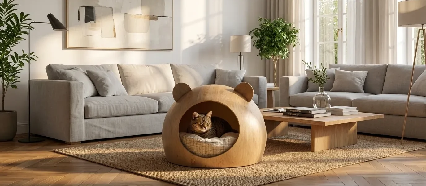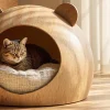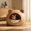This minimalist cat hideaway bed is designed as a dedicated indoor resting space for cats, featuring a rounded wooden form with an enclosed interior. Its compact size allows it to function as a standalone pet bed that fits naturally into everyday living spaces.
