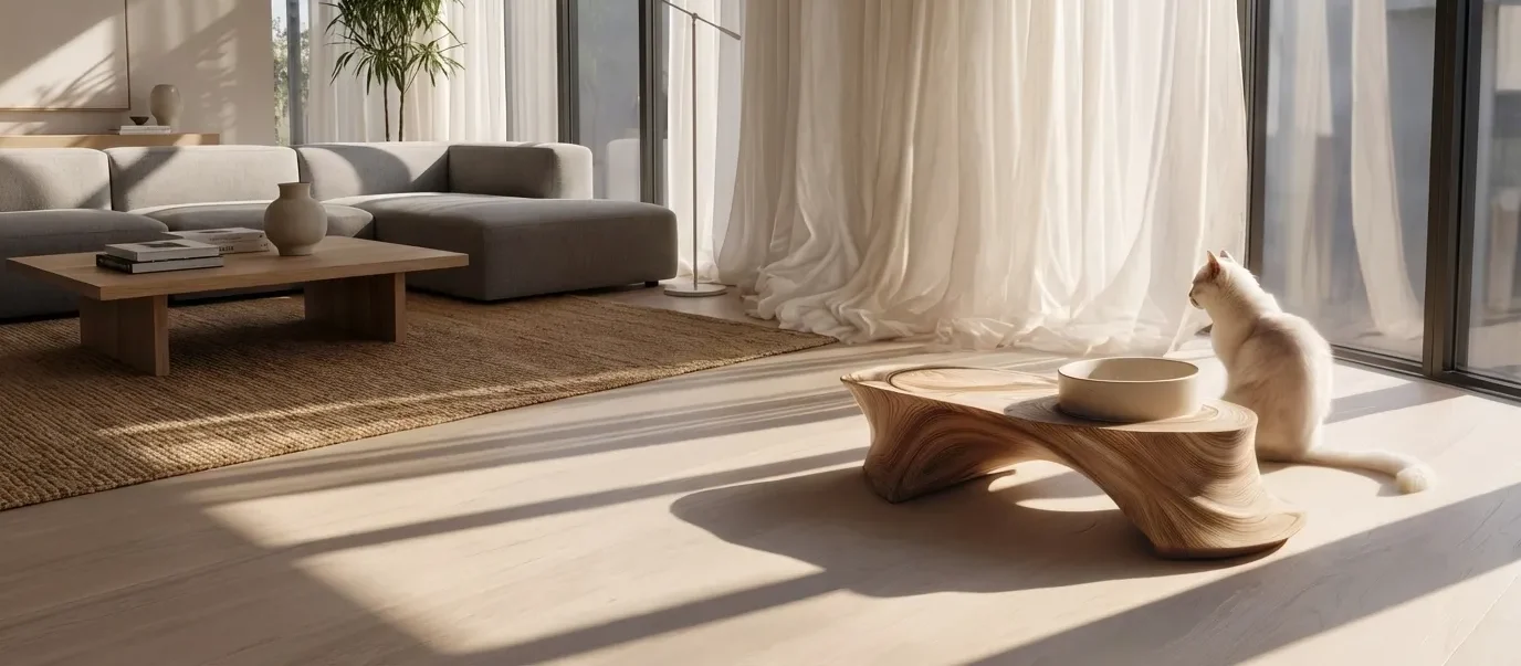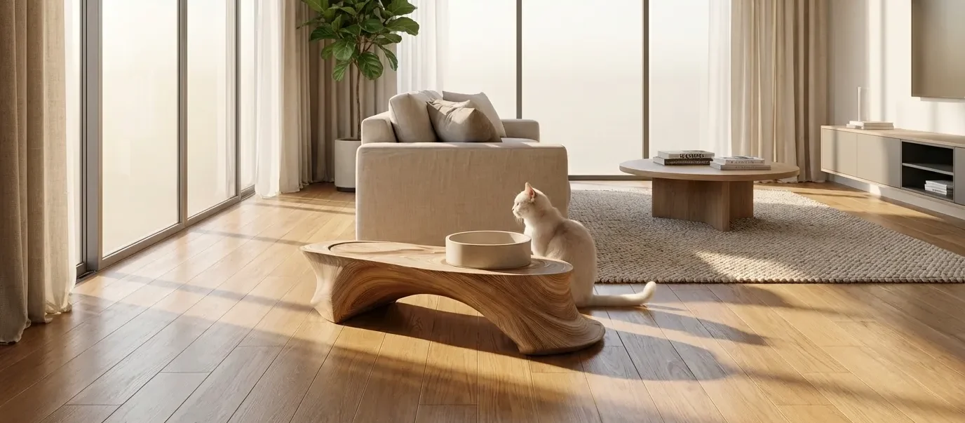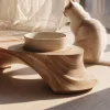 The Organic Sculpted Wooden Cat Bowl Stand is designed as a raised feeding accessory for indoor cat use. The wooden base features a curved form with smooth edges, supporting a bowl within a compact structure. The elevated position places the bowl above floor level, while the integrated design helps keep the bowl positioned within the stand during feeding. Suitable for placement in kitchens, living areas, or designated indoor pet feeding spaces.