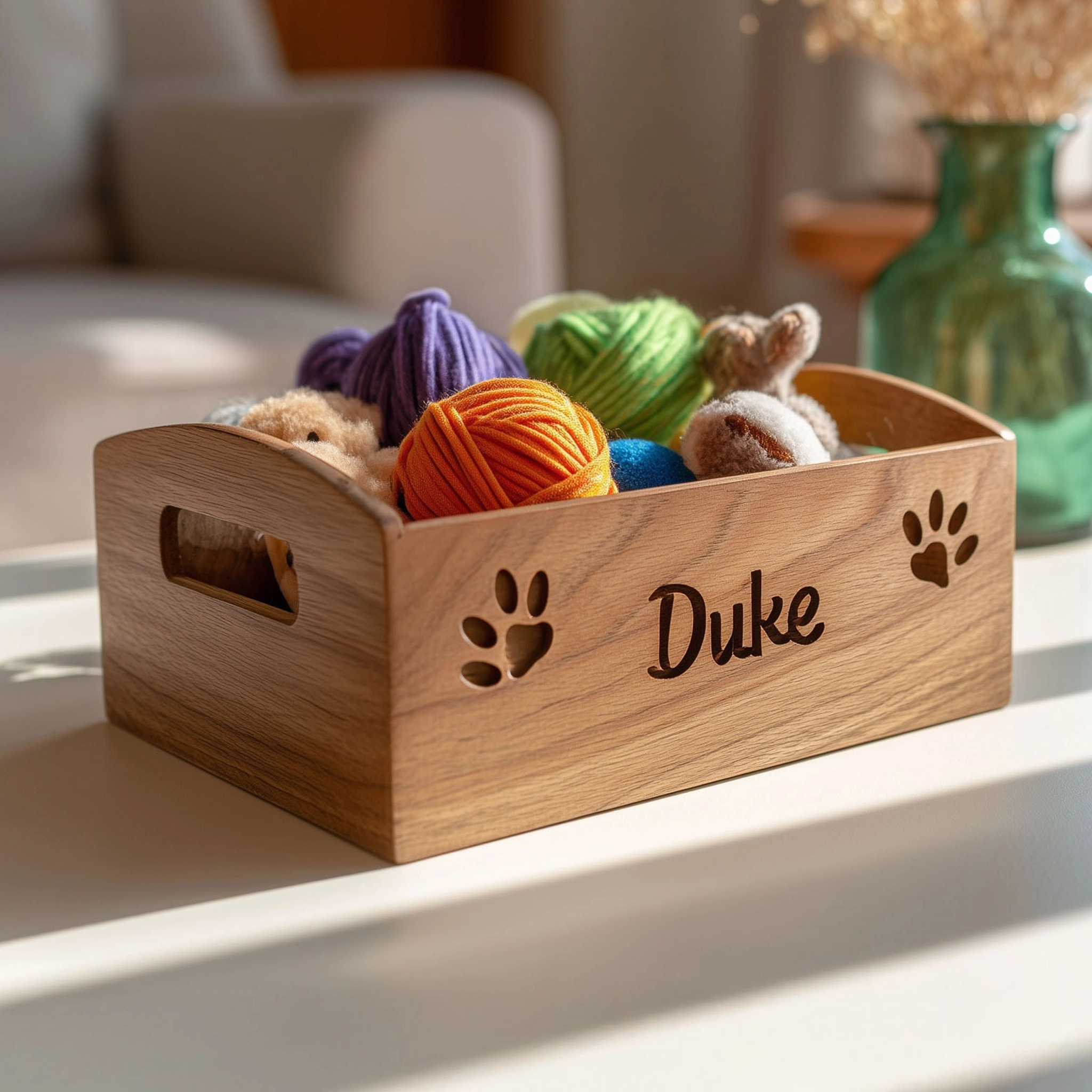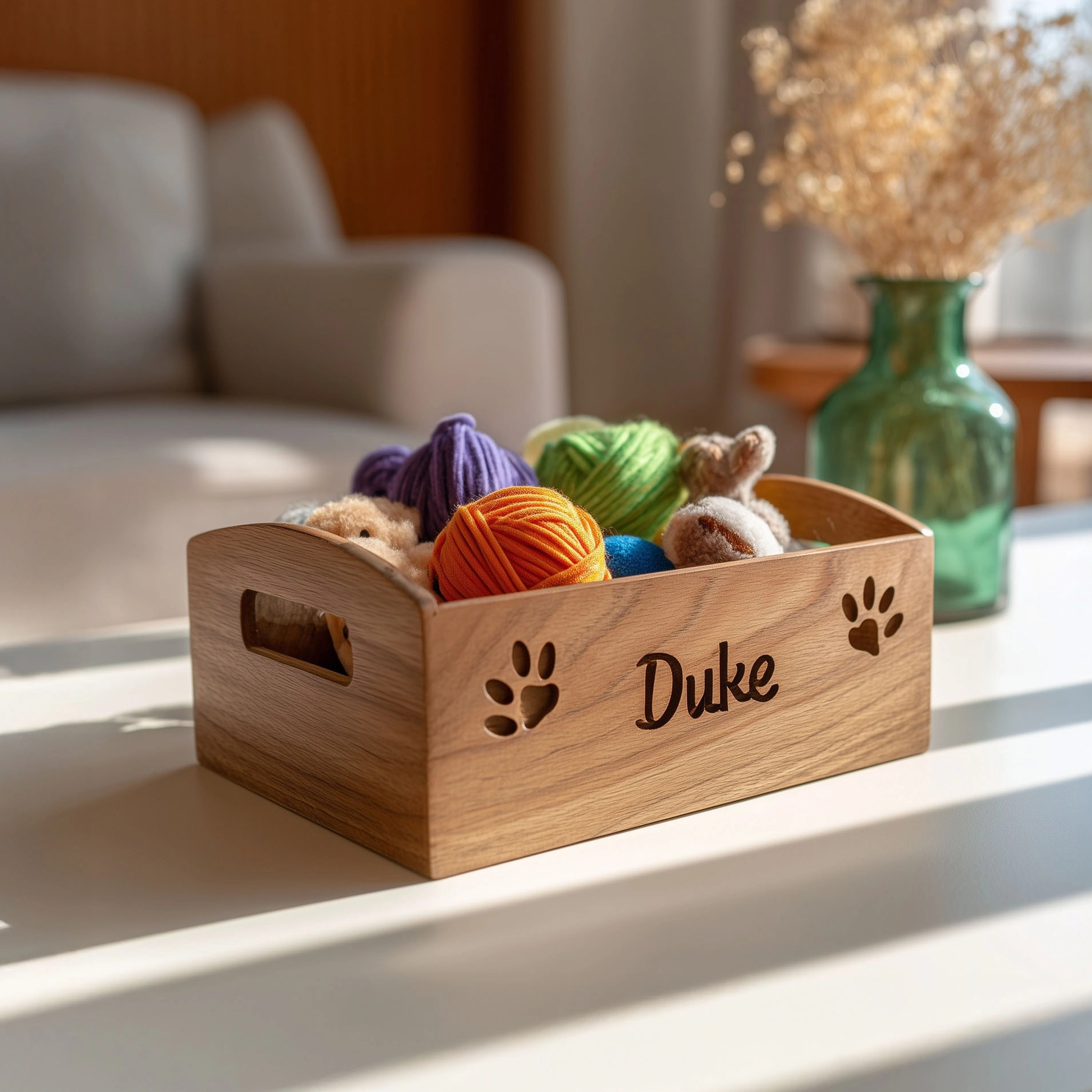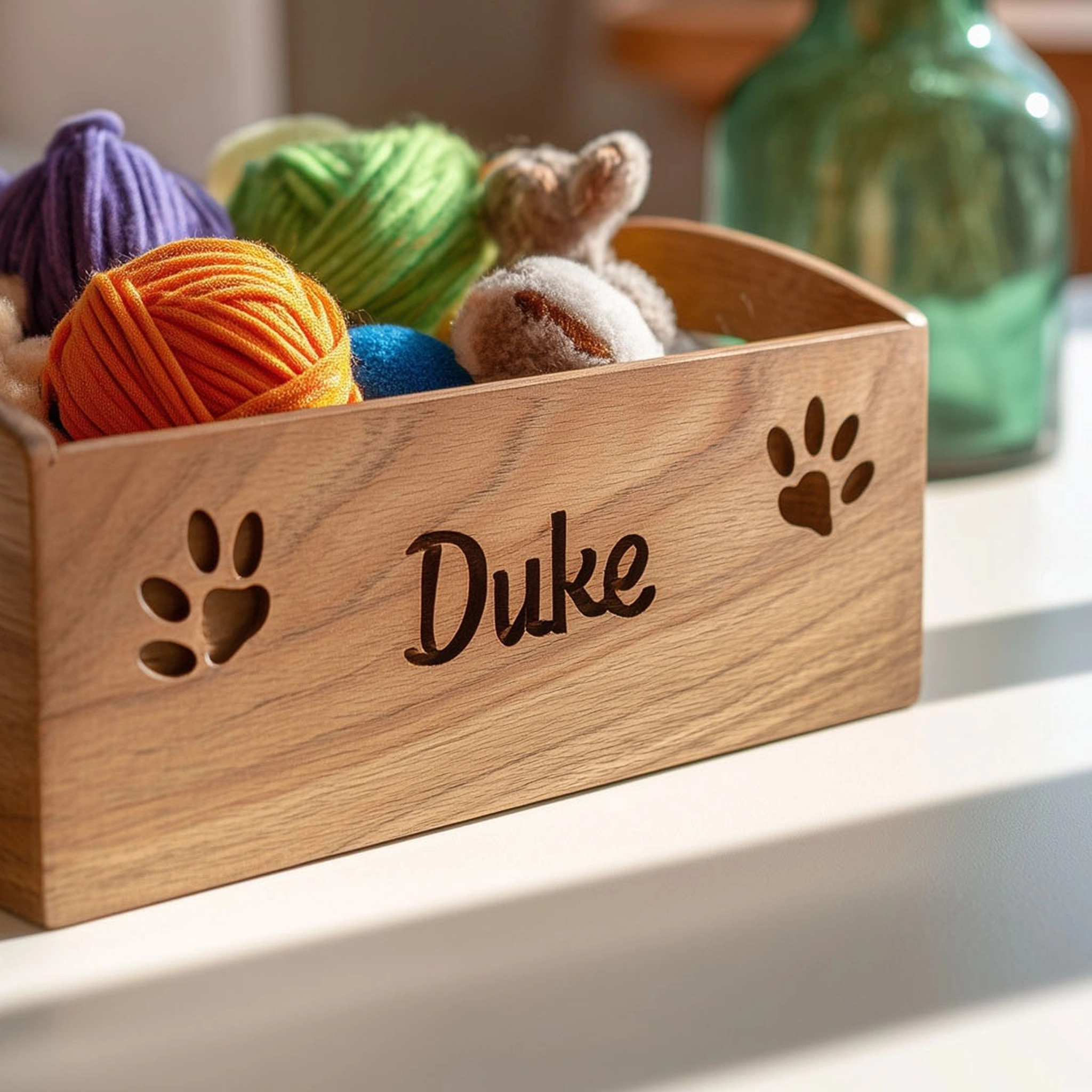 The Rectangular Wooden Pet Toy Organizer with Decorative Name Cutout is a charming and practical solution for storing your pet’s toys. Made from wood, it features an engraved name cutout and playful paw print details, adding a personalized touch to any room. The spacious design keeps toys neatly arranged, while the open handles make it easy to carry and access. This organizer not only helps declutter your space but also enhances your home decor with its elegant wood finish and fun, customized design. Perfect for pet owners looking for a functional and stylish storage solution.